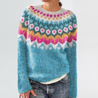 Meet Anika, a playful take on the traditional Icelandic yoke sweater. The soft sky-blue base is lifted by bold rows of fuchsia, gold, and forest green, finished with snowy white accents for a striking Nordic-inspired look.